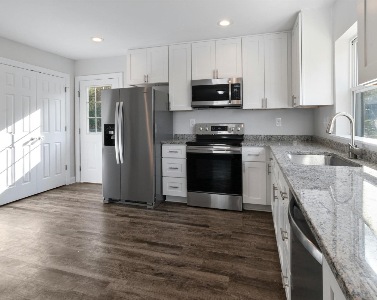 - Durable countertops (granite available)